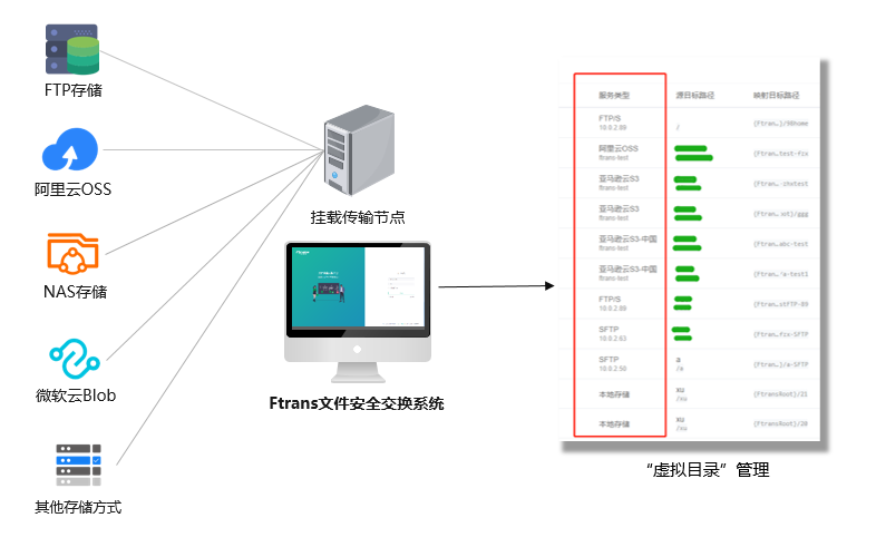该功能支持将企业内部分散的各类存储系统(包括本地存储、FTP/S、SFTP、NAS,以及主流云存储服务如亚马逊S3、微软Azure Blob、阿里云OSS等S3兼容协议)以目录挂载方式集中整合,在保持原有存储系统正常运作的同时,为IT部门带来三大核心价值:
