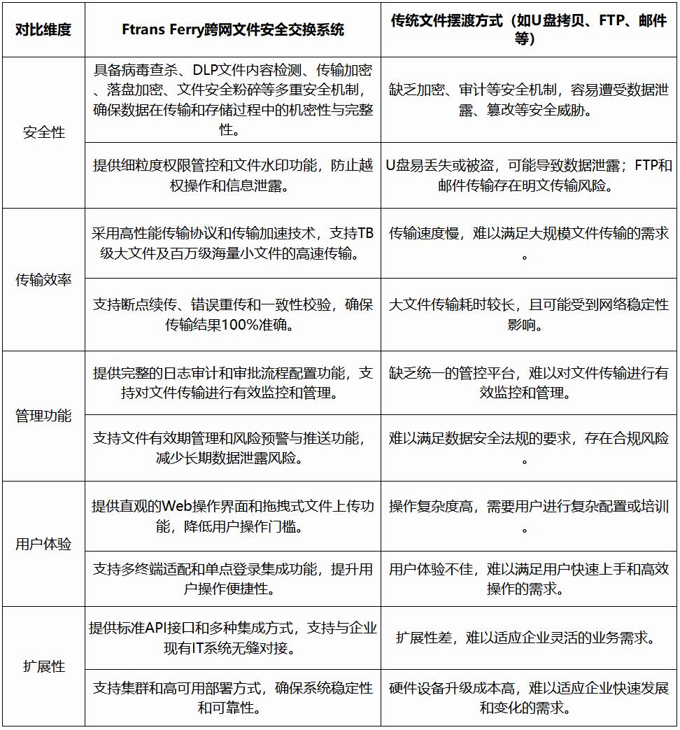 下图是《Ftrans Ferry跨网文件安全交换系统》和传统文件摆渡系统的功能对比:
