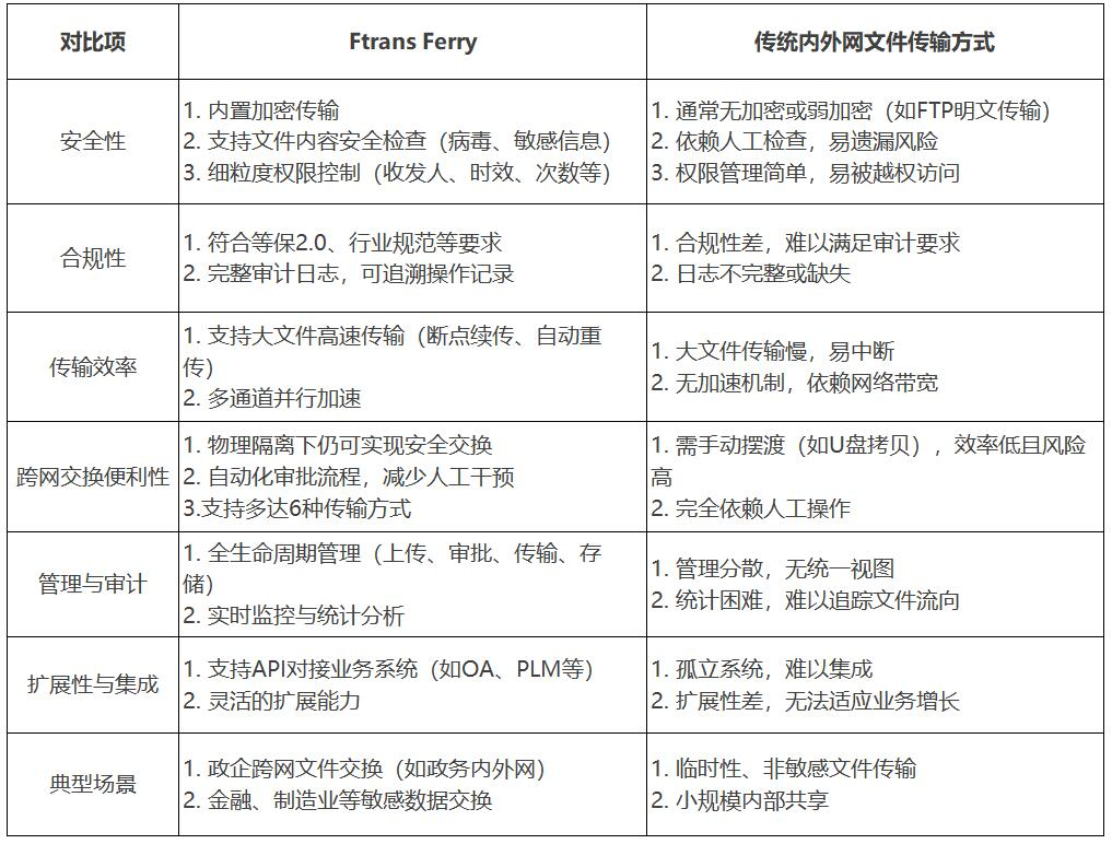 以下是《Ftrans Ferry跨网文件安全交换系统》和其他传统内外网文件摆渡方案的功能对比: