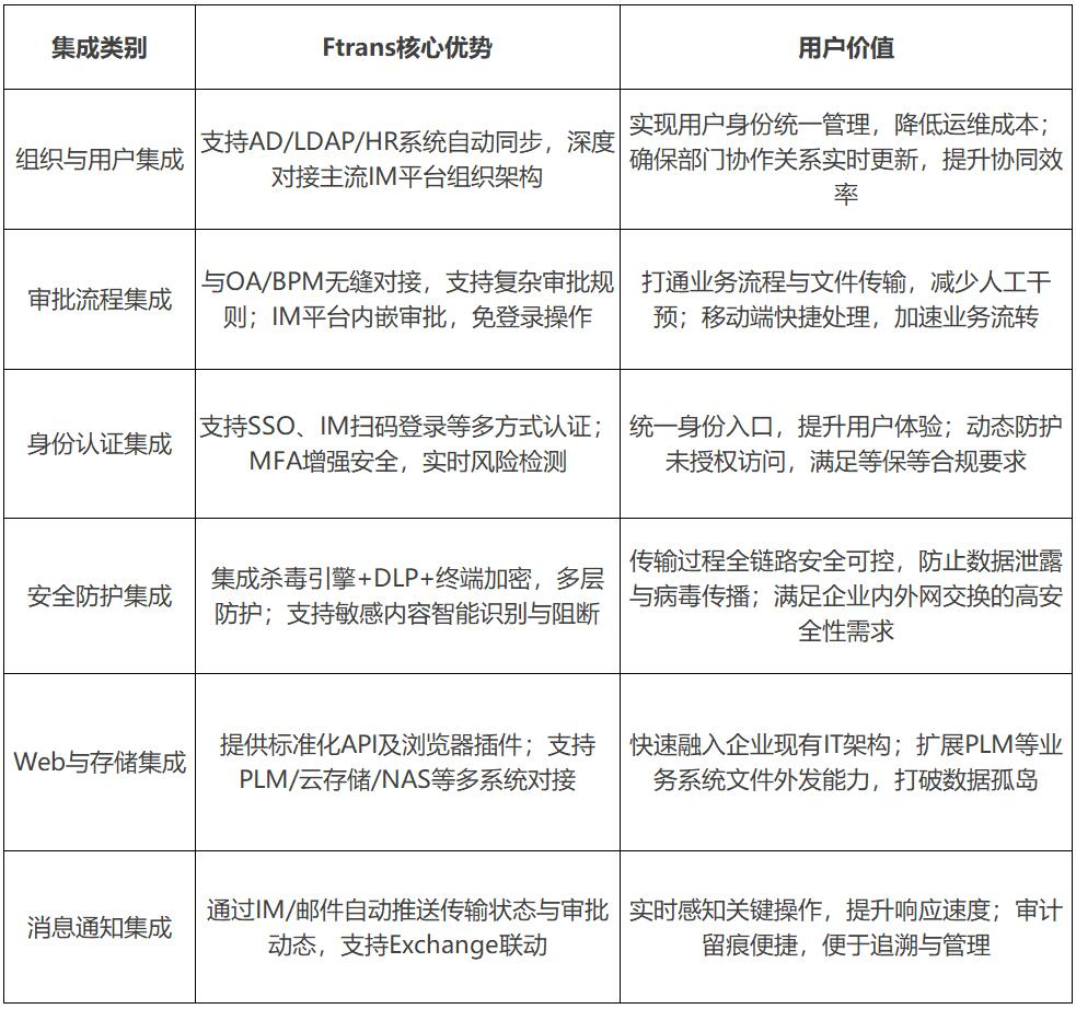 Ftrans飞驰云联文件交换产品的核心集成能力: