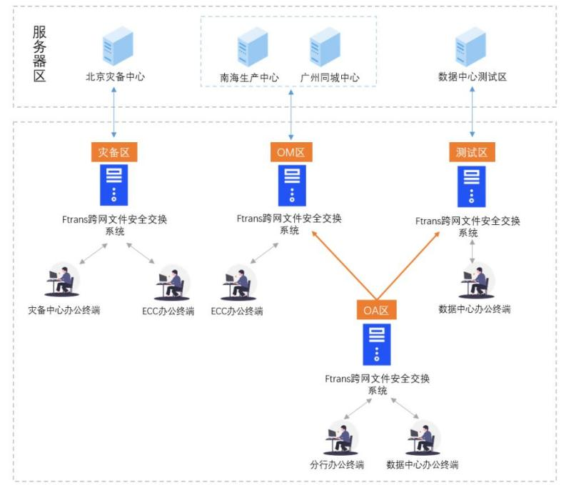在该行OA区、OM区、灾备区、测试区分别部署一套Ftrans跨网文件摆渡系统,并按该行要求配置不同中心用户终端、及文件传输服务器与各区间的文件交换关系。