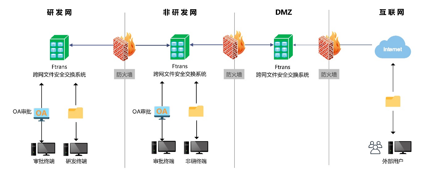 某知名合资电车品牌,是由两大全球知名汽车厂商各持50%股权出资成立的合资公司。基于网络安全建设的需求,该公司通过防火墙将内部网络隔离成了研发网、非研发网、DMZ区三个网络区域。企业进行网络隔离后,仍然存在内外部文件交换需求,具体为: