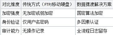 企业跨网络数据传输时,常面临数据泄露、传输中断等安全风险。以金融行业为例,客户敏感信息若通过普通FTP传输,易遭黑客截获,造成重大损失。数据摆渡解决方案通过加密传输、身份认证及审计追踪技术,构建安全隔离通道。例如,Ftrans Ferry跨网文件安全交换系统采用国密算法加密数据,结合权限控制操作日志,确保传输全程可追溯。下表对比传统方式与数据摆渡方案的安全差异: