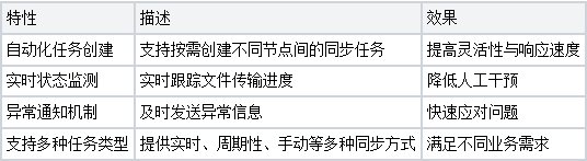 现代企业在文件传输上面临各类挑战,选择高效的文件传输系统,如Ftrans FTC文件传输管控系统,能够显著提升工作效率。这个同步软件推荐具有强大的功能,支持自动化任务,实现实时和周期性同步。企业能够根据自身需求,快速创建不同节点之间的文件传输任务。与此同时,该系统提供了任务监测功能,让管理员及时掌握每项传输的状态,从而减少了人工干预,提高了工作效率。通过异常通知机制,团队可以迅速回应潜在问题,确保业务安全稳定运行。下表列出了Ftrans FTC系统的关键特性及其对提高工作效率的贡献: