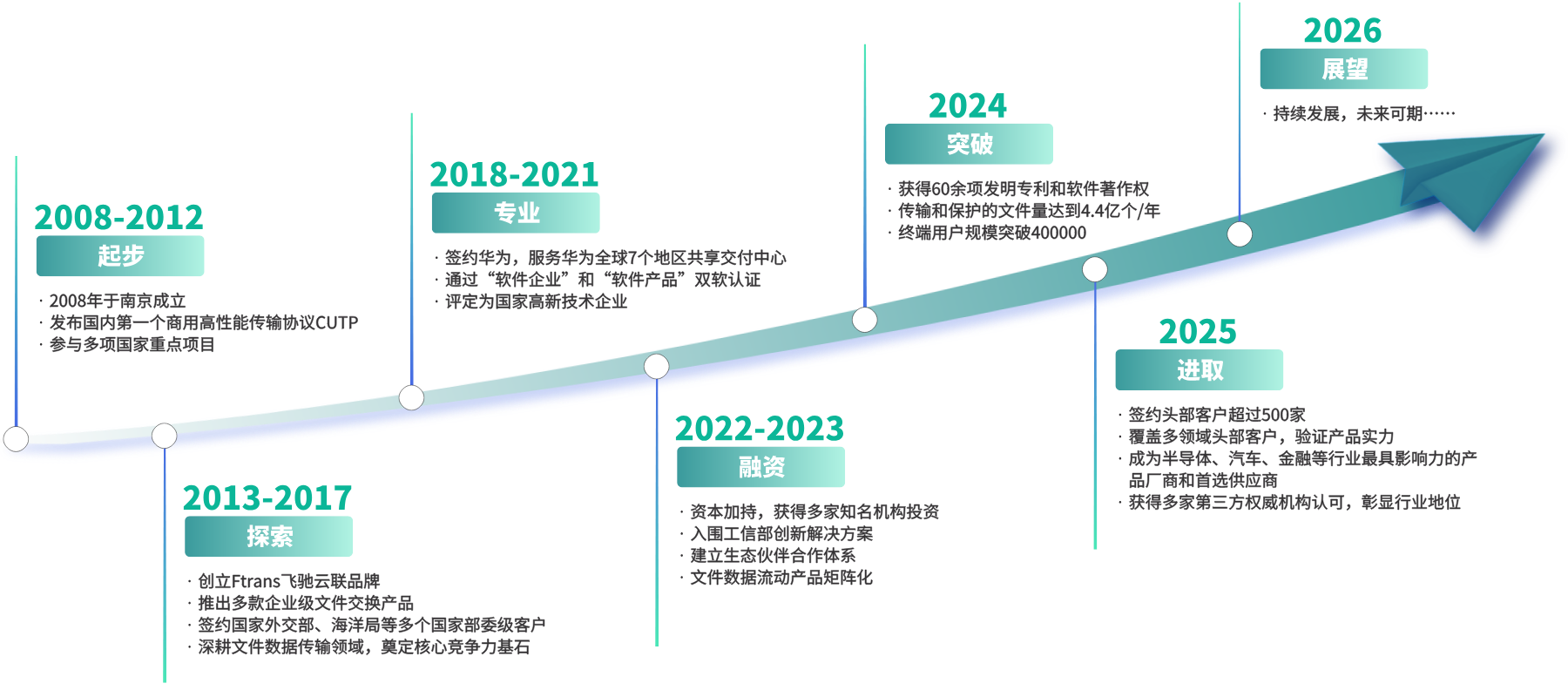飞驰云联是中国领先的数据安全传输解决方案提供商,长期专注于安全可控、性能卓越的数据传输技术和解决方案,公司产品和方案覆盖了跨网跨区域的数据安全交换、供应链数据安全传输、数据传输过程的防泄漏、FTP的增强和国产化替代、文件传输自动化和传输集成等各种数据传输场景。飞驰云联主要服务于集成电路半导体、先进制造、高科技、金融、政府机构等行业的中大型客户,现有客户超过500家,其中500强和上市企业150余家,覆盖终端用户超过40万,每年通过飞驰云联平台进行数据传输和保护的文件量达到4.4亿个。