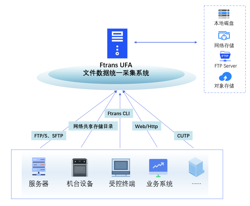 要有效地实现生产过程的可视化,企业可以考虑使用Ftrans UFA文件数据统一采集系统,有助于解决“多台设备数据采集怎么实现”的挑战,使得制造流程更加高效和透明。提供多种数据采集手段、支持多种数据设备和系统、可靠⽀持内部多种设备系统数据同时采集、数据采集过程可视化可监控、按需设置不同的采集策略和人员使用权限管理、⽀持接⼊NAS、FTP、对象存储等设备作为后端存储。帮助企业全面灵活、安全可靠地进行文件数据的采集和管理,实现数据的有效整合,创造更⼤的数据价值。