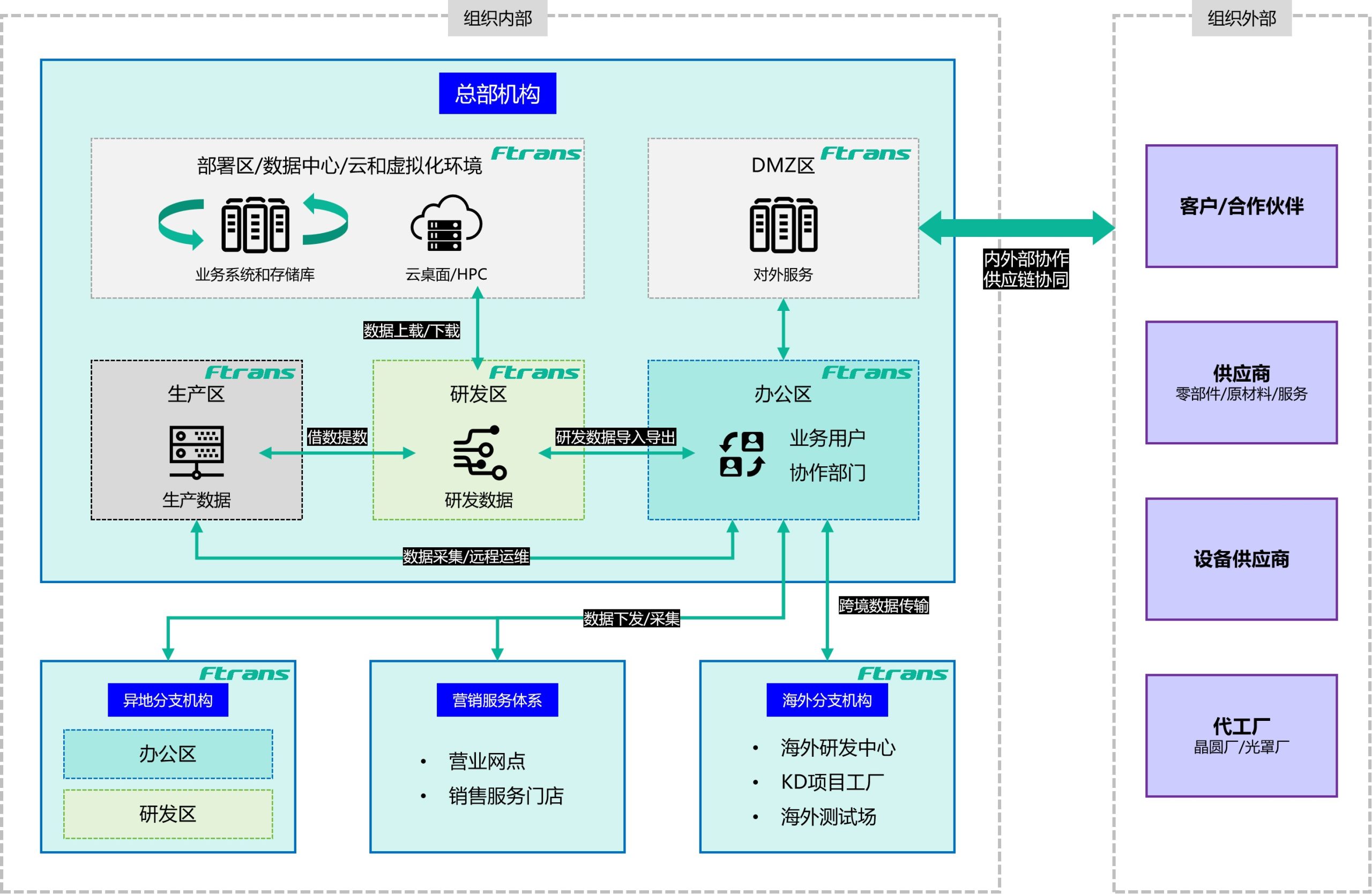 - 多地域协同传输:支撑总部与异地/海外分支机构、营销网点间的数据分发、收集与跨境传输