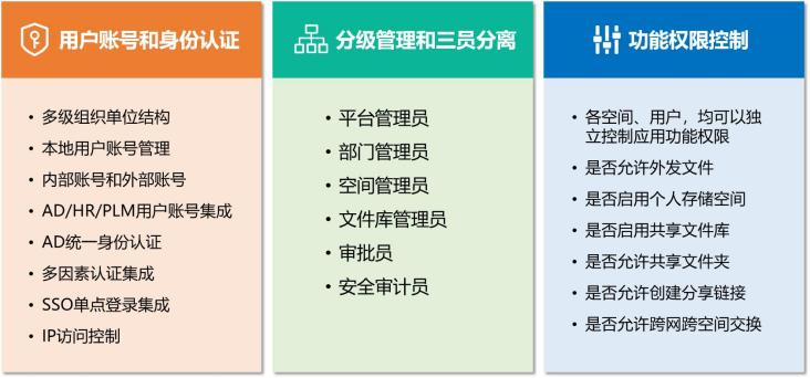 内置防病毒引擎DLP内容安检功能,自动扫描病毒文件、识别敏感信息,从源头规避风险;遵循三员分立机制,基于角色、部门设置细粒度权限,搭配会签、转审等灵活审批流程;