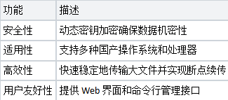 信创文件传输系统在多个领域展现出强大的核心功能。首先,安全性是其一大特色,系统采用动态密钥加密,保障数据传输过程中的机密性。其次,适用性方面,该系统能够全面支持多种国产操作系统和处理器,确保与国有技术环境的兼容。同时,它具备高效性,能够稳定传输大文件和海量数据,利用虚拟分块和拼接技术实现快速的断点续传功能。最后,用户友好性也是其不可或缺的部分,通过简洁的Web界面与命令行管理,使得不同层次的用户都能高效操作。以下表格简要总结了这些核心功能: