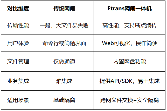 《Ftrans网络安全隔离与信息交换系统》作为新一代网闸文件交换一体机的代表,不仅保留了传统网闸的安全隔离核心能力,更通过内置专业的跨网文件摆渡软件,解决了传统产品在传输效率、安全管控、用户体验等方面的根本性短板。